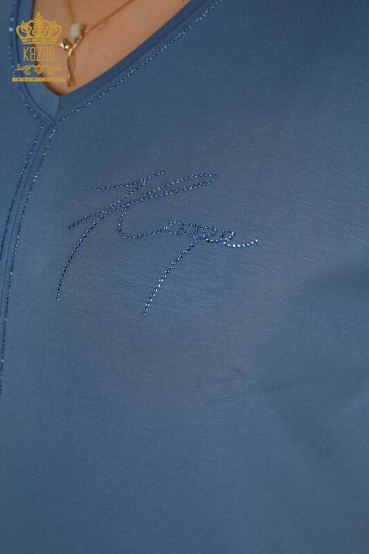Venta al por mayor Conjunto de chándal de mujer con bordado de piedra, bolsillo, manga corta, índigo - 20391 | kazee