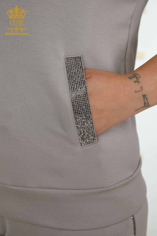 Venta al por mayor Conjunto de chándal para mujer con capucha y bordado de piedra gris con bolsillo - 20392 | kazee
