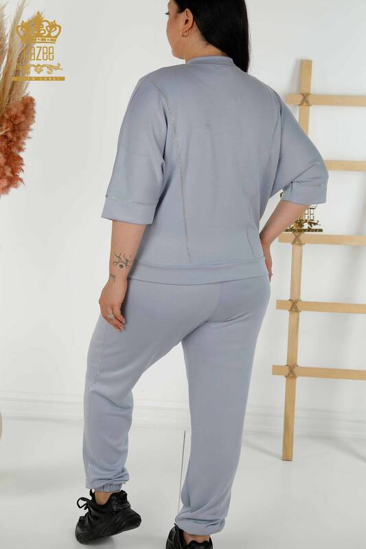 Venta al por mayor Conjunto de chándal para mujer de manga corta con bolsillo bordado de piedra azul - 20393 | kazee