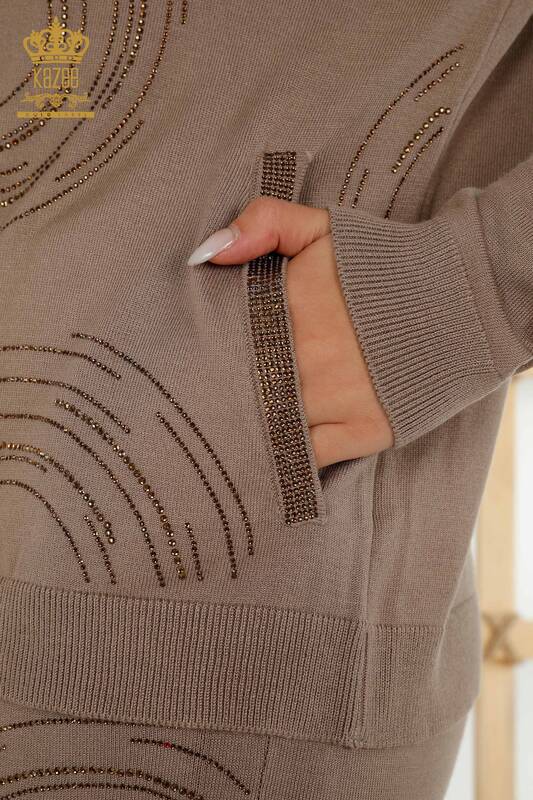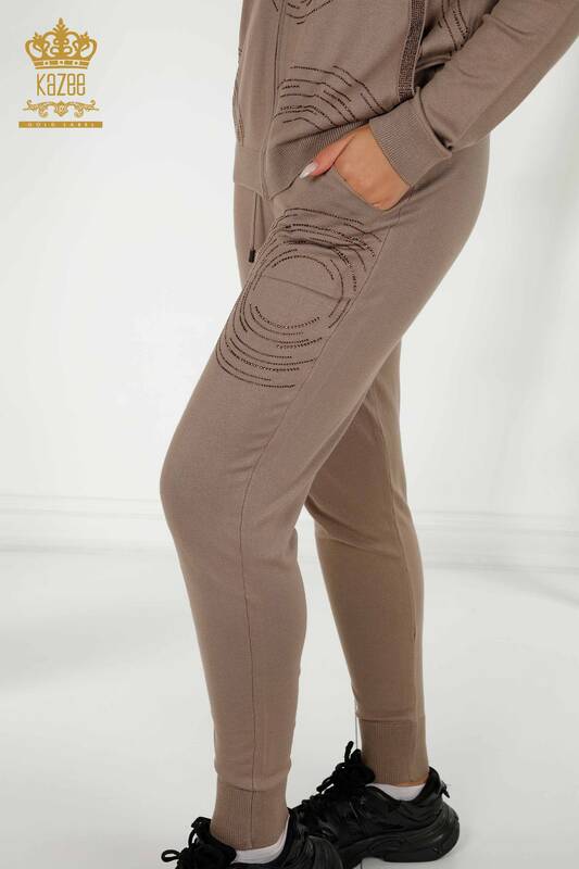 Venta al por mayor Conjunto de chándal para mujer con cremallera y bolsillo bordado en piedra Visón - 16276 | KAZEE
