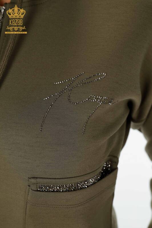 بدلة رياضية نسائية بالجملة بجيب مقنعين مطرز بأحجار كريمة كاكي - 17426 | كازي
