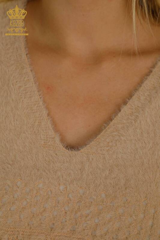 Женский вязаный свитер оптом из ангоры с V-образным вырезом, перфорированный, бежевый - 30697 | КАЗИ
