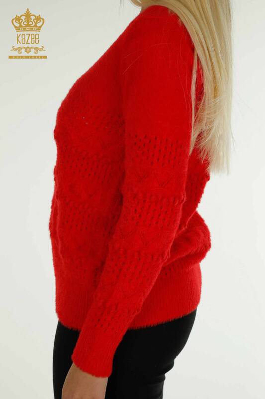 Женский вязаный свитер оптом из ангоры с V-образным вырезом, перфорированный красный - 30697 | КАЗИ