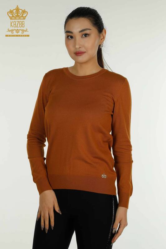 Женский трикотаж оптом, свитер с круглым вырезом и базовым логотипом, светло-коричневый - 11052 | КАЗИ