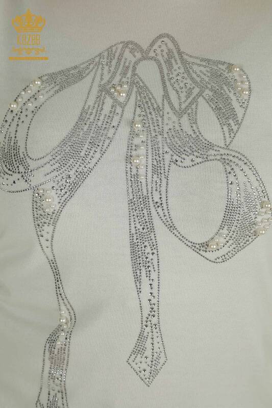 Оптовая продажа женского трикотажного свитера с вышитым бисером камнем и воротником-стойкой цвета экрю - 30672 | КАЗИ