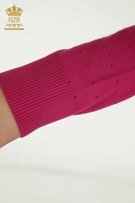Женский вязаный свитер оптом с вышитым камнем воротником-стойкой цвета фуксии - 30677 | КАЗИ