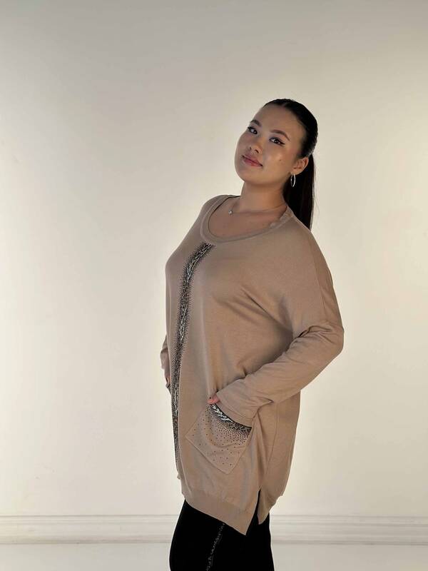 Оптовая продажа женского трикотажа Карманный свитер с каменной вышивкой и леопардовым узором с круглым вырезом Бежевый - 30621 | КАЗИ