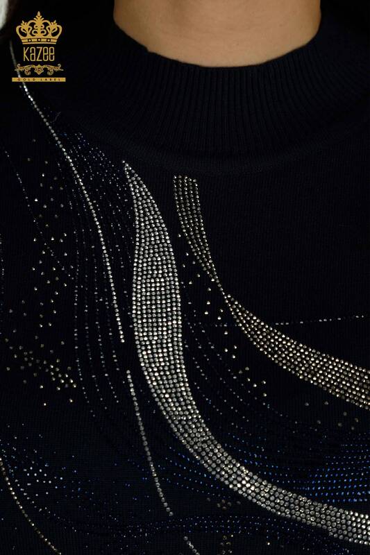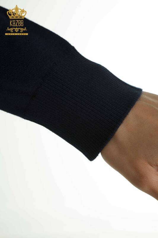 Женский вязаный свитер оптом с вышитым воротником-стойкой Crystal Stone, темно-синий - 30469 | КАЗИ