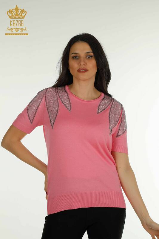 Оптовая продажа женского трикотажа Свитер с вышивкой на плечах и коротким рукавом Розовый - 30792 | КАЗИ