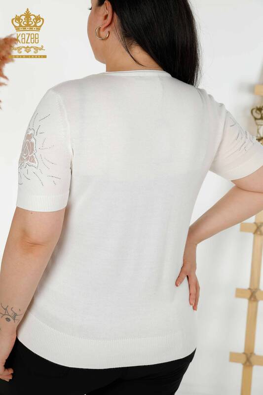 Женский вязаный свитер оптом с розовым узором и вышивкой камнями, экрю - 16845 | КАЗИ