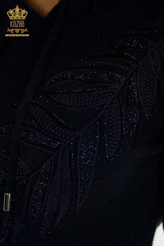 Оптовая продажа Женский трикотаж Свитер с капюшоном из ангоры с вышивкой в виде листьев темно-синего цвета - 40008 | КАЗИ