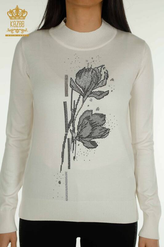 Оптовые женские трикотажные свитера с цветочным узором и каменной вышивкой, с длинным рукавом, экрю - 30656 | КАЗИ