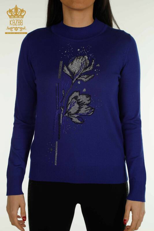Оптовые женские трикотажные свитера саксы с длинным рукавом и цветочным узором, вышитые камнем - 30656 | КАЗИ