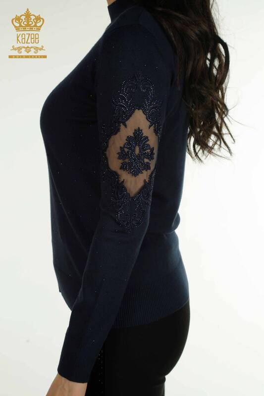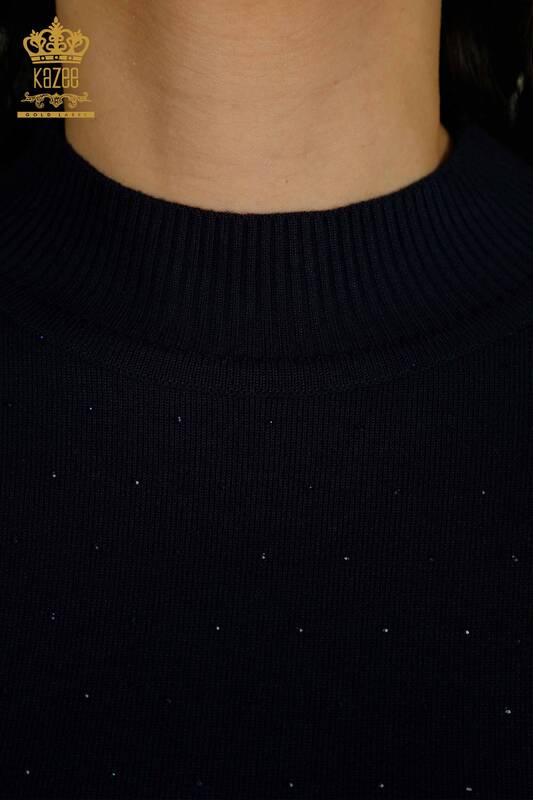Женский вязаный свитер оптом с вышитыми камнями, темно-синий с длинным рукавом - 30892 | КАЗИ
