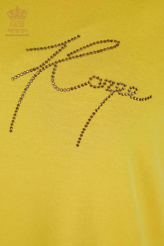 Оптовая женская блузка на пуговицах с каменной вышивкой и коротким рукавом желтого цвета - 79297 | КАЗИ