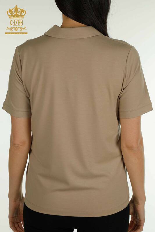 Оптовая женская блузка с воротником-поло и пуговицами с коротким рукавом бежевого цвета - 79503 | КАЗИ