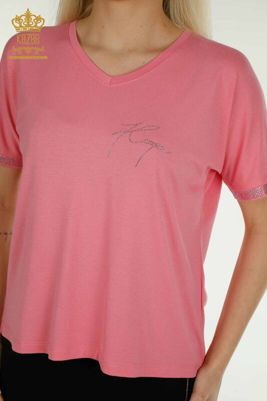 Оптовая продажа женской блузки на пуговицах с каменной вышивкой и коротким рукавом розового цвета - 79297 | КАЗИ