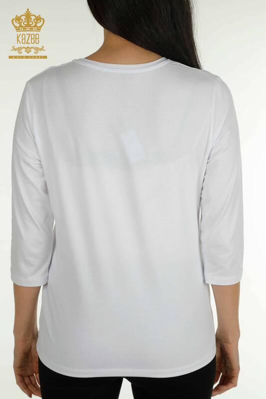 Оптовая женская блузка с вышивкой розой и коротким рукавом с каменной вышивкой, белая - 79867 | КАЗИ