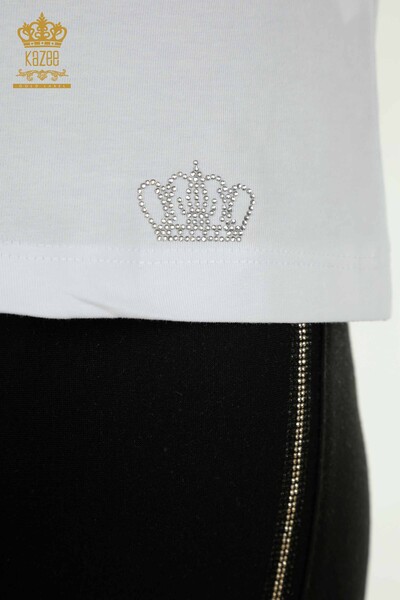 Оптовая женская блузка с коротким рукавом и вышивкой камнями, V-образным вырезом, белая - 79561 | КАЗИ