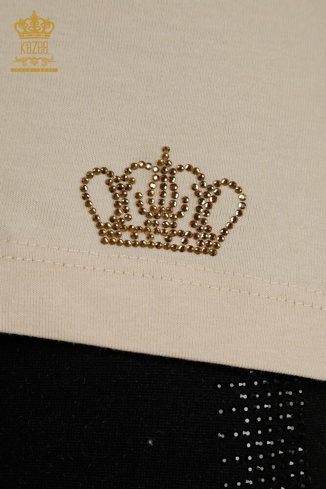 Оптовая женская блузка с коротким рукавом и вышивкой камнями и V-образным вырезом светло-бежевого цвета - 79561 | КАЗИ