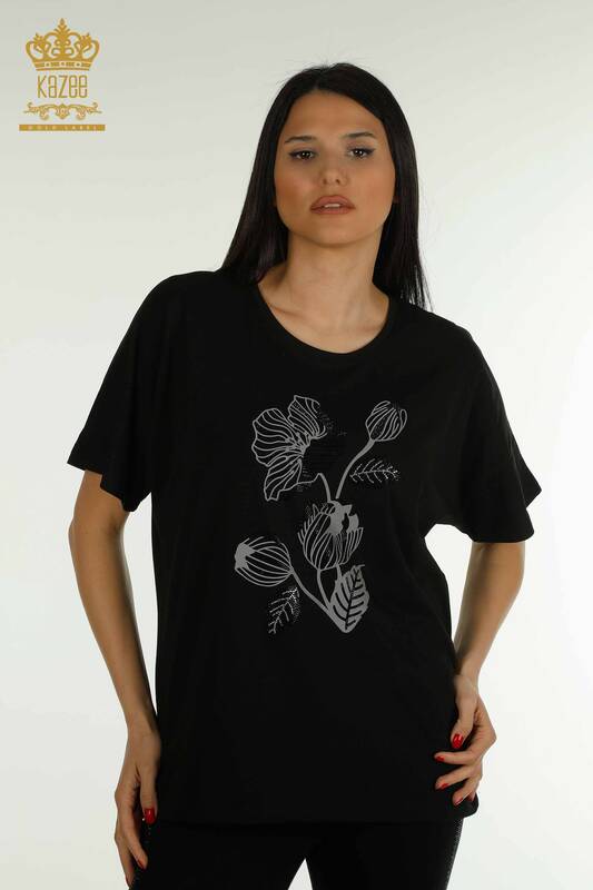 Оптовая женская блузка с цветочной вышивкой из хрустального камня и вышивкой с коротким рукавом, черная - 79459 | КАЗИ