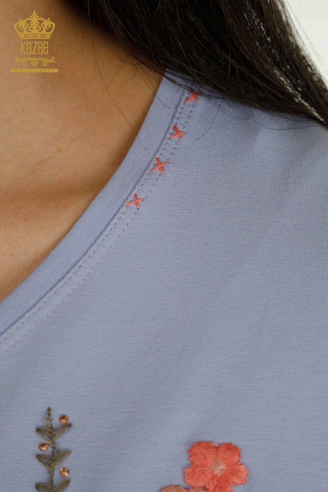 Оптовая женская блузка с цветочной вышивкой и каменной вышивкой с V-образным вырезом, сиреневый - 79466 | КАЗИ