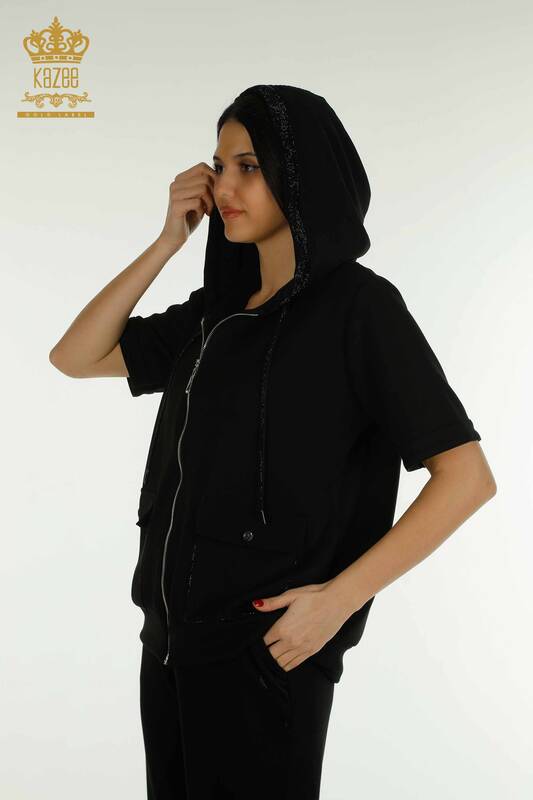 Черный женский спортивный костюм оптом с застежкой-молнией с капюшоном и вышивкой камнями - 17675 | КАЗИ