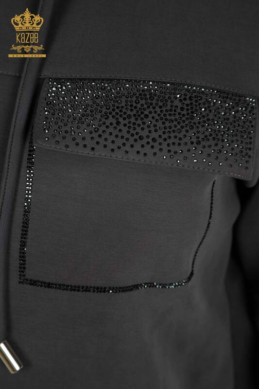 оптовый женский спортивный костюм с капюшоном на молнии и каменной вышивкой, серый - 17618 | КАЗИ