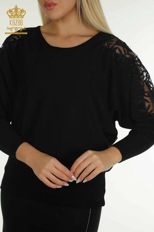 Оптовая продажа женского трикотажного свитера из тюля с каменной вышивкой черного цвета - 15699 | КАЗИ