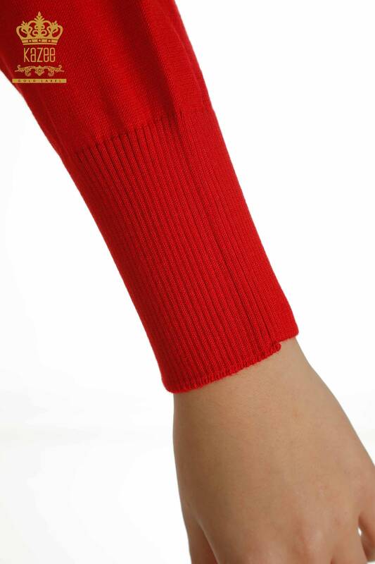Оптовая продажа женского трикотажного свитера из тюля с каменной вышивкой красного цвета - 15699 | КАЗИ