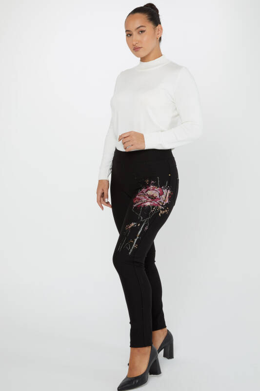 Pantalón Negro con Bordado de Piedras de Flores y Cintura Elástica - 3778 | KAZEE (Juego de 4 36-38-40-42)