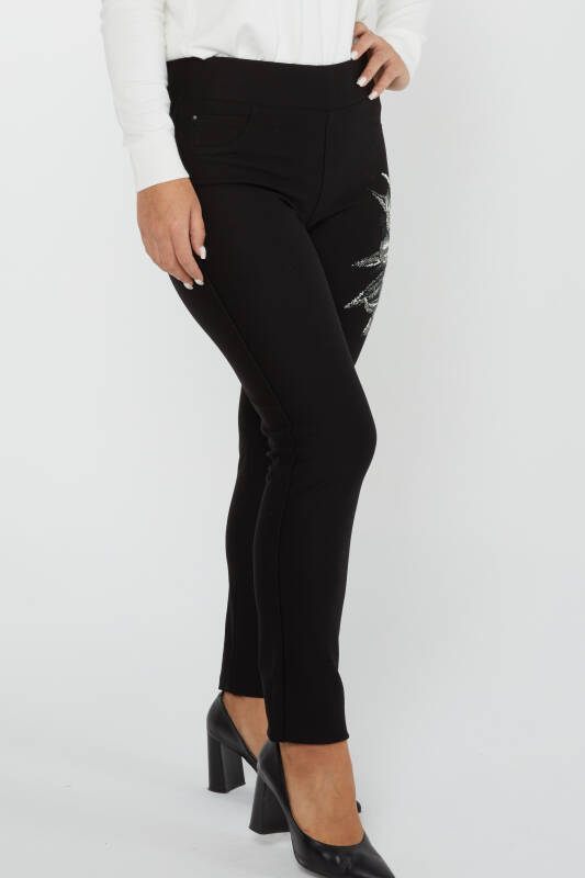 Pantaloni Neri con Ricamo Fiore Pietra ed Elastico in Vita - 3710 | KAZEE (Set da 4 42-44-46-48)