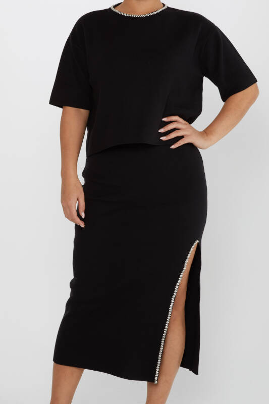 Czarny podwójny garnitur z rozcięciem i haftem w kamienie - 31302 | KAZEE (zestaw 3 sztuk S-M-L)