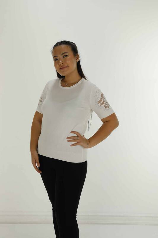 Prendas de punto de tul pedrería con cuello redondo y manga corta Crudo - 30927 | KAZEE