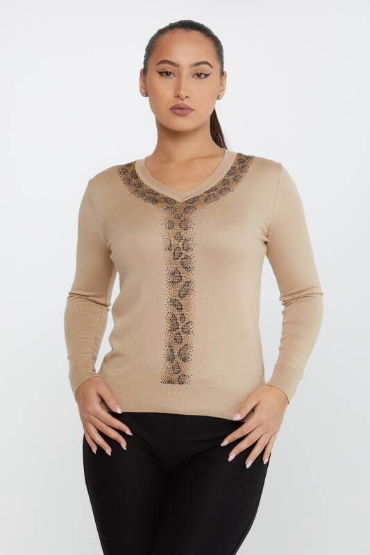 Pull En Maille Motif Léopard Pierre Brodée Beige - 30749 | KAZEE (Lot de 4 M-L-XL-2XL)