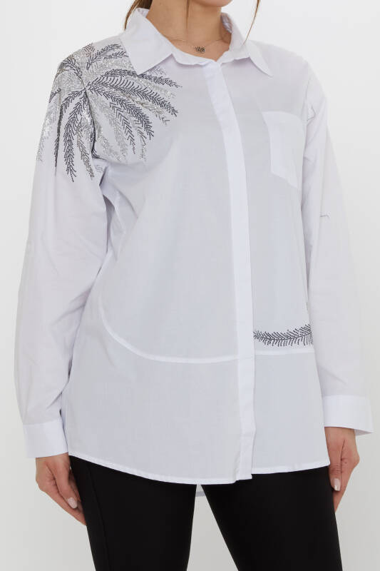 قميص أبيض بتفاصيل جيب وتطريزات حجرية - 20557 | كازي (طقم من 3 قطع، مقاسات 46-48-50)