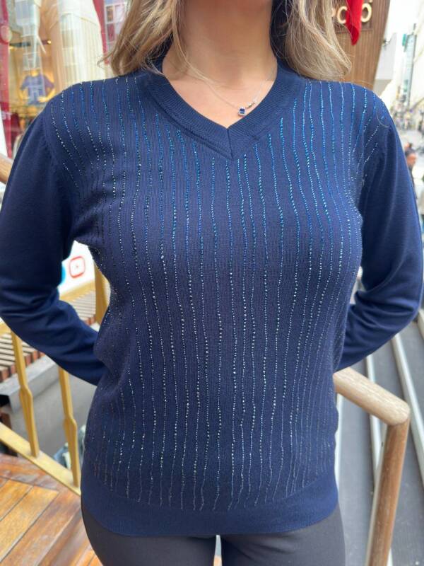 Вязаный свитер темно-синего цвета с полосатой отделкой из камней - 31500 | KAZEE (комплект из 3 предметов L-XL-2XL)