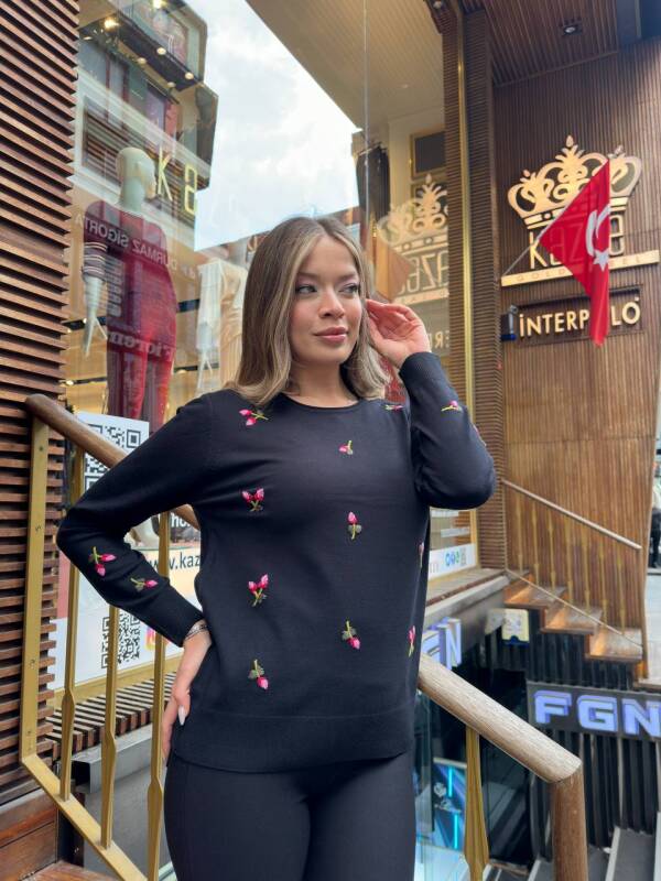 Вязаный свитер с цветочной вышивкой, круглый вырез, черный - 32167 | KAZEE (комплект из 3 предметов S-M-L)