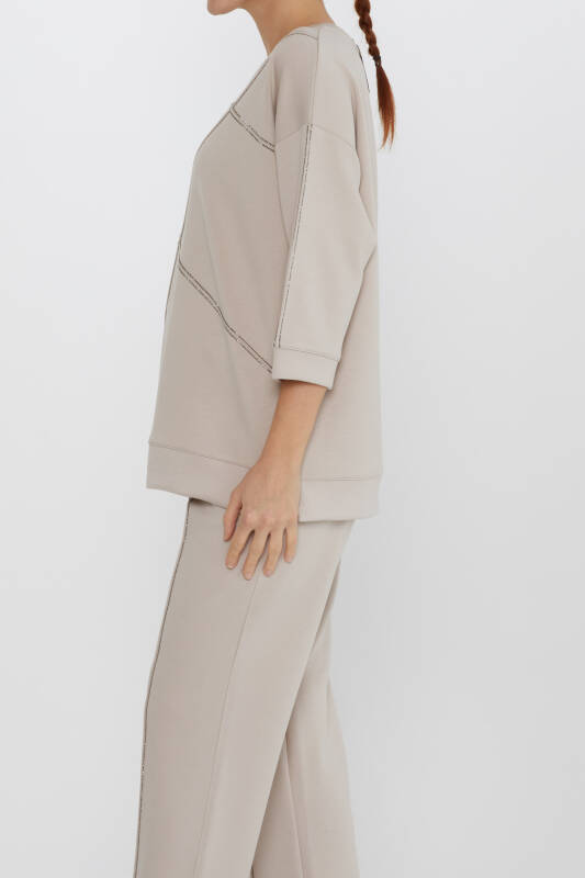 Two-Piece Set Stone Embroidered Short Sleeve Beige - 17741 | KAZEE (Set of 4 S-M-L-XL)