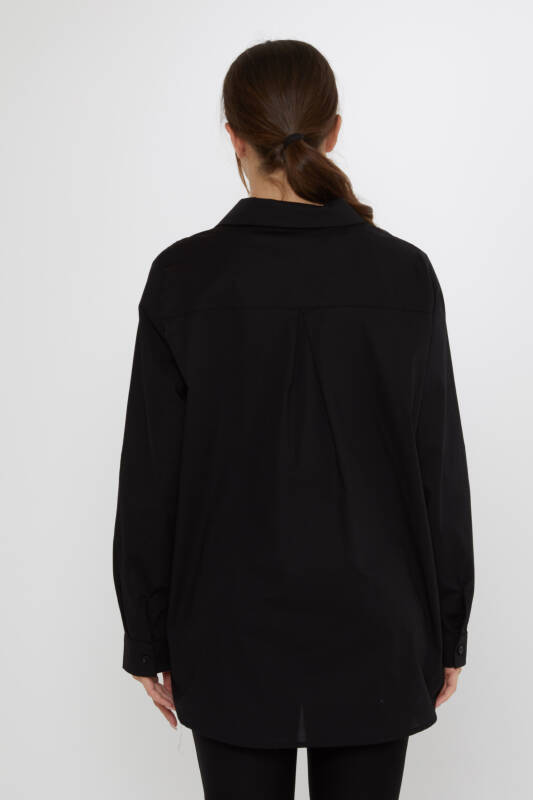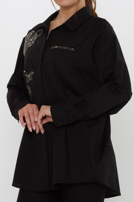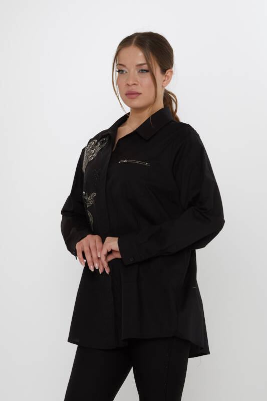 Shirt with Butterfly Pattern, Pocket Detail, Stone Embellished, Black - 20535 | KAZEE (3-Piece Set 46-48-50)
