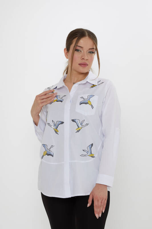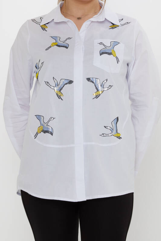 Shirt with Colorful Stone Embellished Bird Pattern, Ecru - 20523 | KAZEE (3-Piece Set 40-42-44)