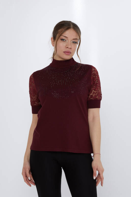 Strickpullover mit Spitzenärmeln und Steinstickerei, Weinrot – 30959 | KAZEE (4er-Set M-L-XL-2XL)