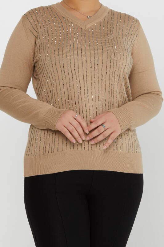 Strickpullover mit Streifen und Steinstickerei, langärmlig, Beige – 31500 | KAZEE (3er-Set L-XL-2XL)