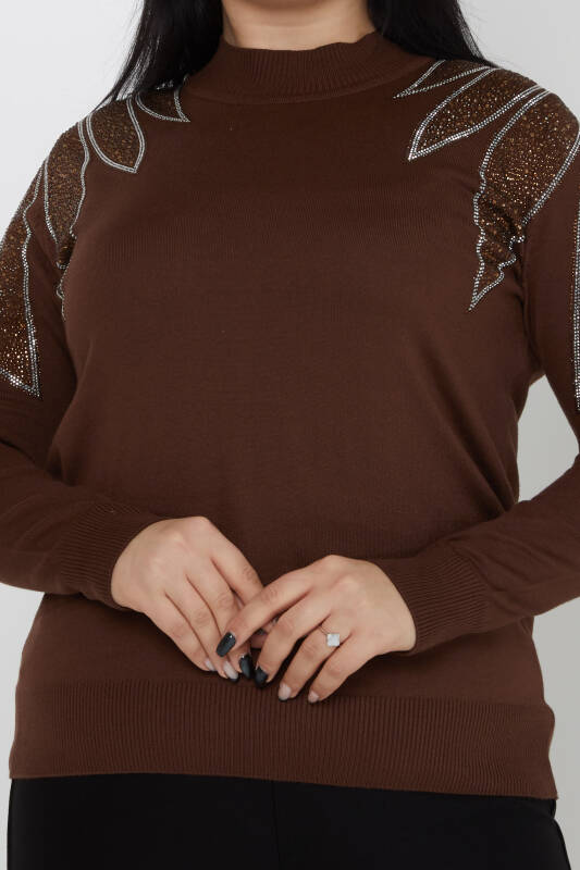 Suéter de punto con cuello alto y hombros bordados con piedras marrón - 31601 | KAZEE (Juego de 3 tallas M-L-XL)