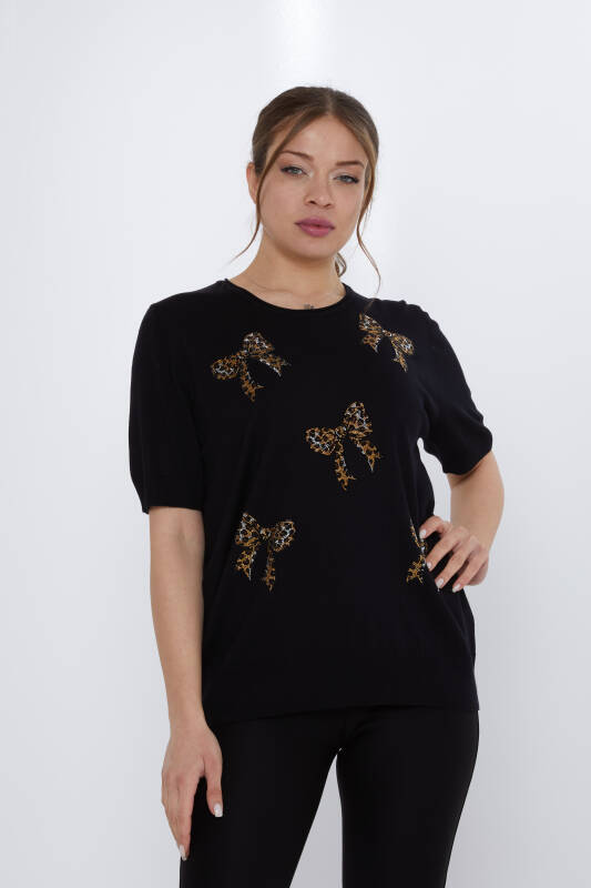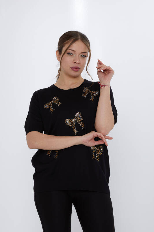 Suéter de punto con lazo bordado de piedras y manga corta negro - 31577 | KAZEE (Juego de 3 XL-2XL-3XL)