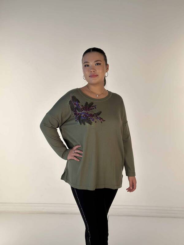 Suéter de punto para mujer al por mayor con bordado de piedras y manga larga color caqui - 30750 | KAZE