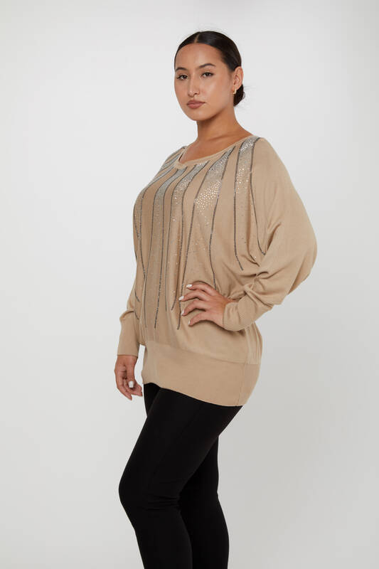 سترة محبوكة بأكمام خفاش مطرزة بالأحجار من المنك - 30675 | كازي (مجموعة من 4 مقاسات L-XL-2XL-3XL)