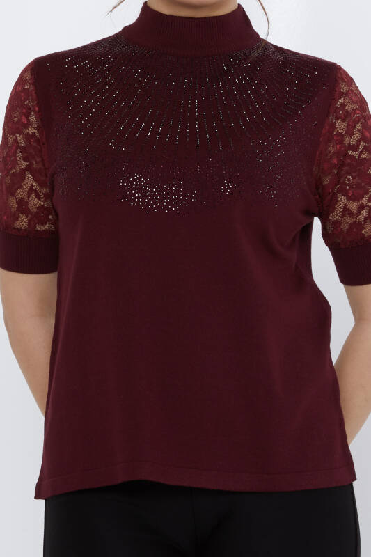 سترة محبوكة بأكمام من الدانتيل مطرزة بالأحجار باللون الأحمر الداكن - 30959 | كازي (مجموعة من 4 مقاسات M-L-XL-2XL)