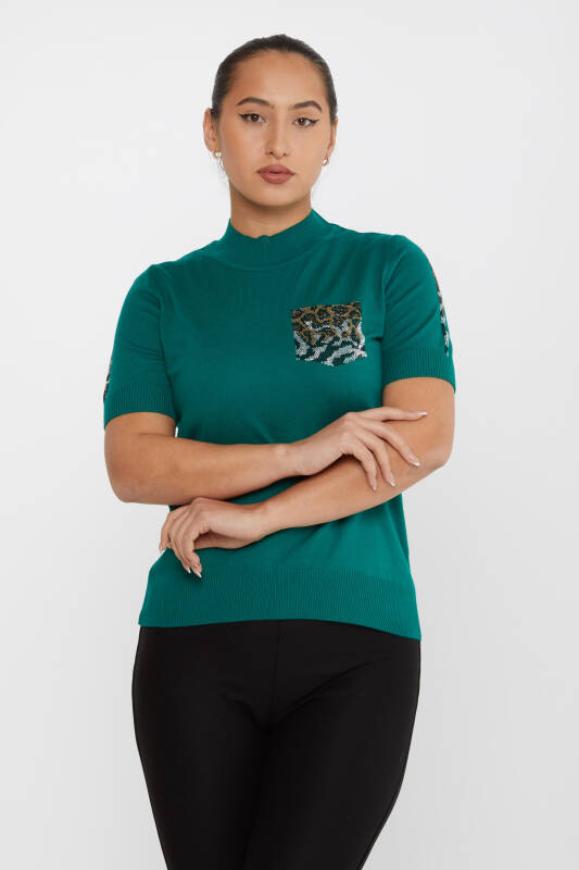 سترة محبوكة بنقشة جلد النمر مع ياقة قائمة باللون الأخضر - 31623 | كازي (مجموعة من 4 مقاسات M-L-XL-2XL)