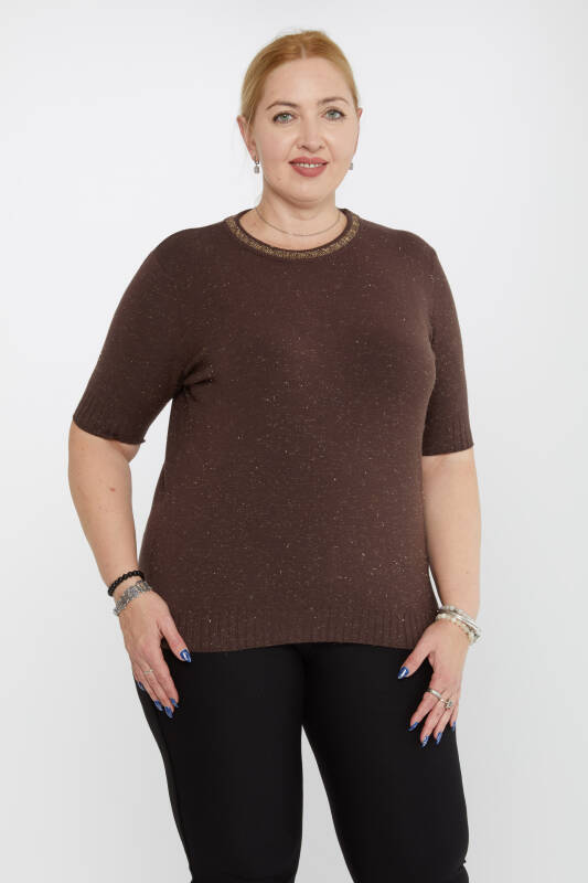 سترة محبوكة بياقة مزينة بترتر وأكمام قصيرة باللون البني - 31610 | كازي (مجموعة من 3 مقاسات XL-2XL-3XL)